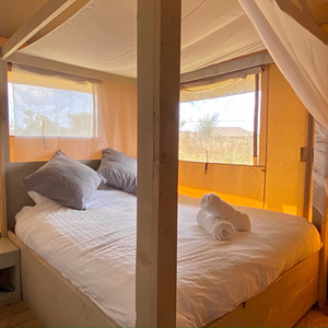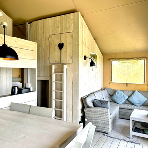 The spacious and chic Safari Tents sleep up to six guests and offer stunning vistas of the west coast and year-round sunsets over the Atlantic Ocean. Each tent includes a double four-poster bed, a bunk bedroom and a double cabin bed which is accessible by a short ladder, plus a full kitchen, dining table, lounge area and ensuite facilities. Private decks and enclosed gardens make these tents perfect for BBQ nights with friends and for children to enjoy outdoor play.