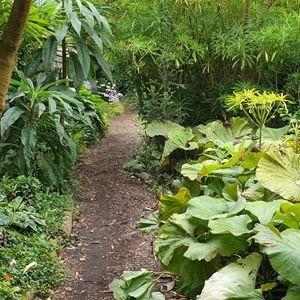 Wandering through the winding paths and jungle-like glades allows you to discover a wide range of plants including Giant Geraniums, Echiums, Palm trees, Bamboos, Yams (Collocasia & Alocasia), Banana trees, Tree Ferns and Camellias galore.