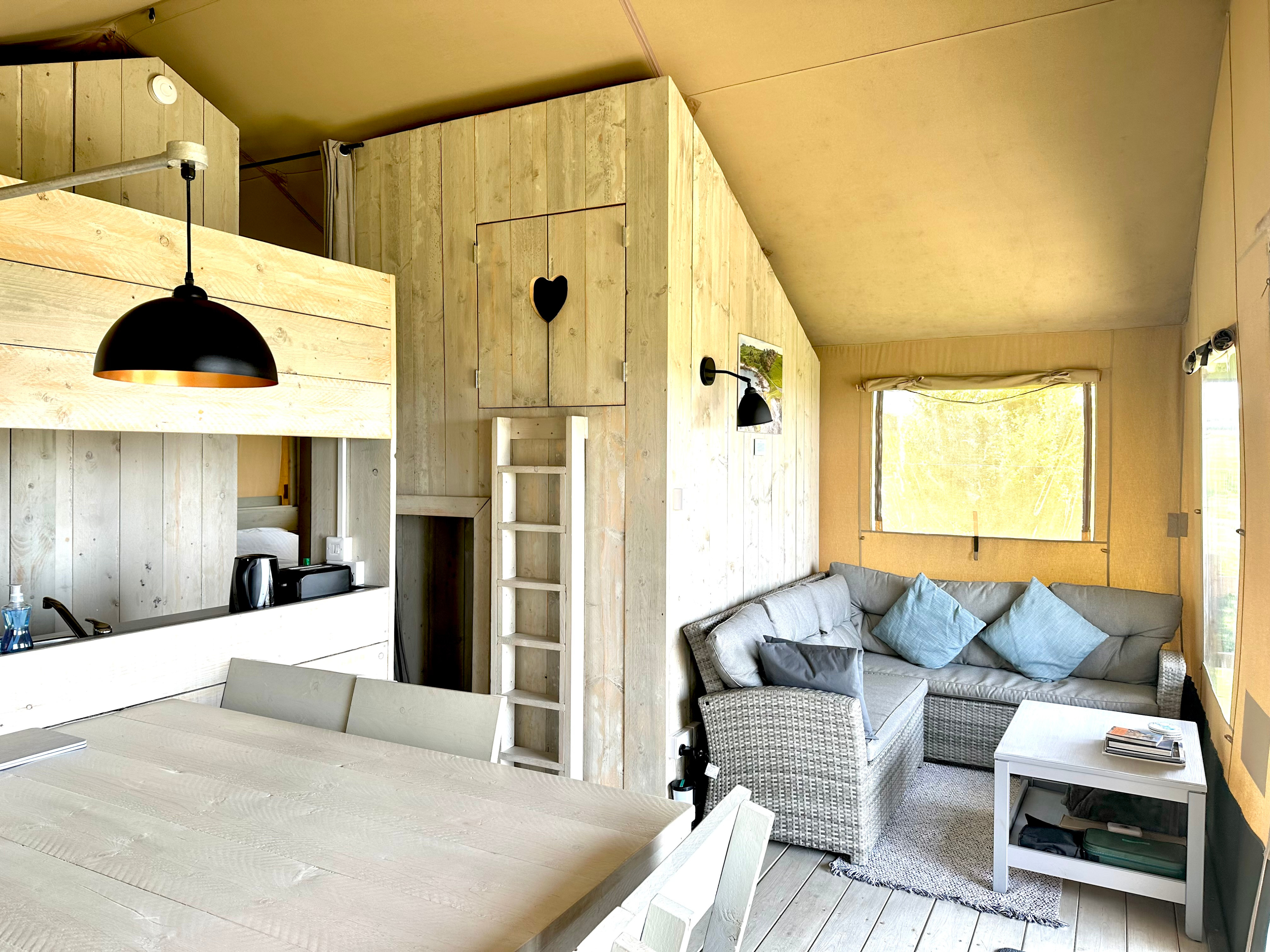 The spacious and chic Safari Tents sleep up to six guests and offer stunning vistas of the west coast and year-round sunsets over the Atlantic Ocean. Each tent includes a double four-poster bed, a bunk bedroom and a double cabin bed which is accessible by a short ladder, plus a full kitchen, dining table, lounge area and ensuite facilities. Private decks and enclosed gardens make these tents perfect for BBQ nights with friends and for children to enjoy outdoor play.