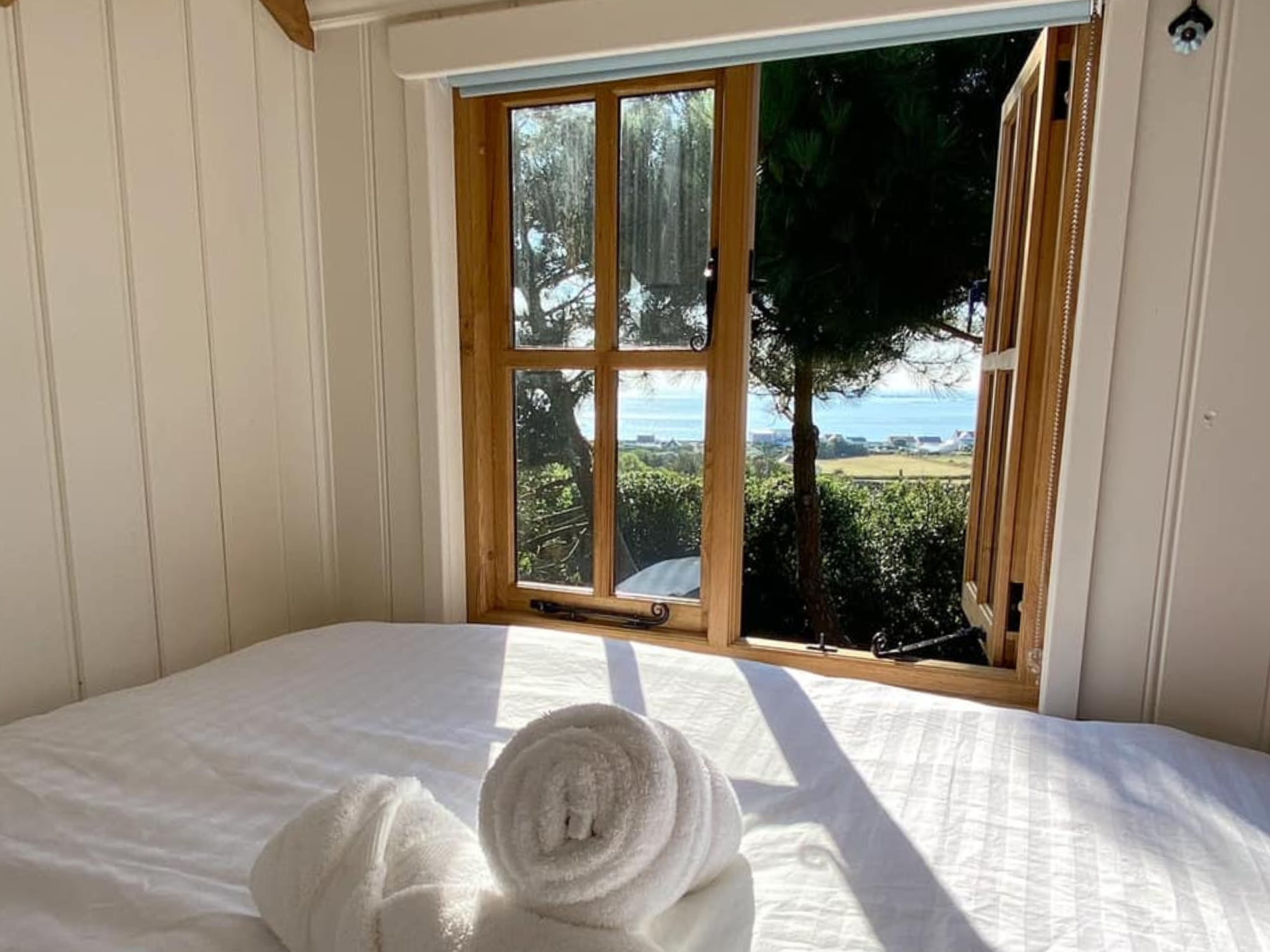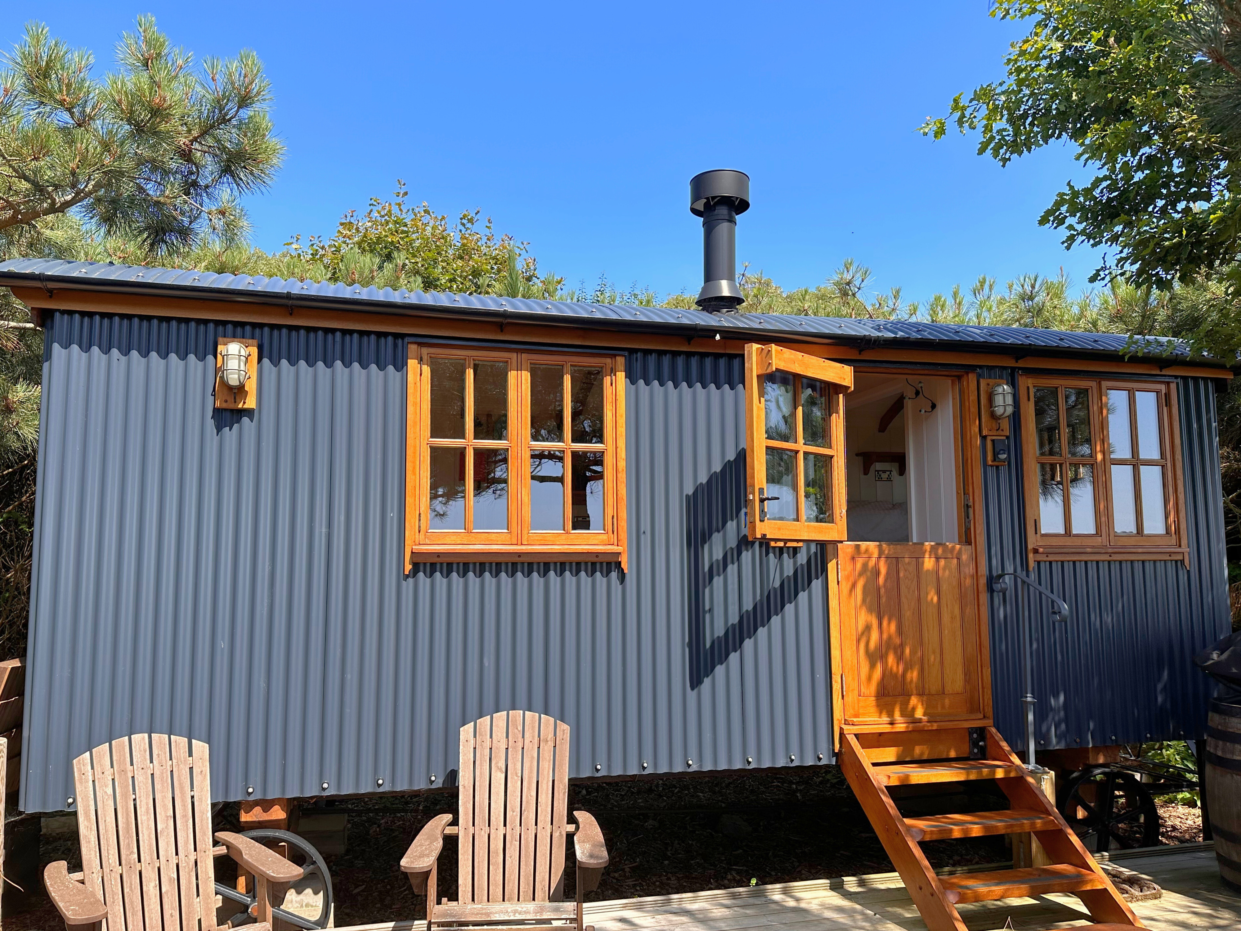Discover ultimate relaxation in the beautifully-designed Shepherd Huts which comfortably accommodate two adults, with ensuite facilities, a log burning stove and full kitchen. The huts are strategically nestled among the pine trees for complete privacy, ideal for a romantic getaway or solo retreat. Enjoy breath-taking sunset sea views from the comfort of your bed.