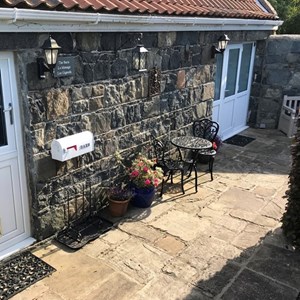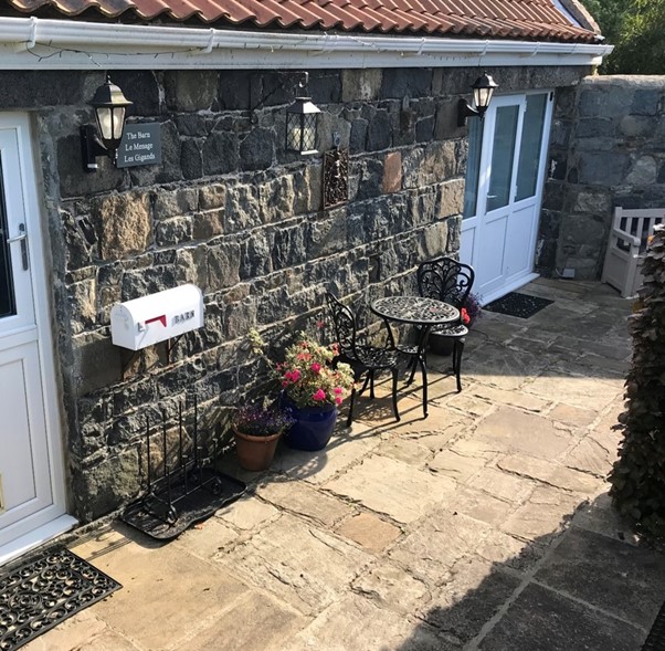 A private, illuminated pathway leads up to the barn. There is also a small private garden courtyard with bistro table and chairs.