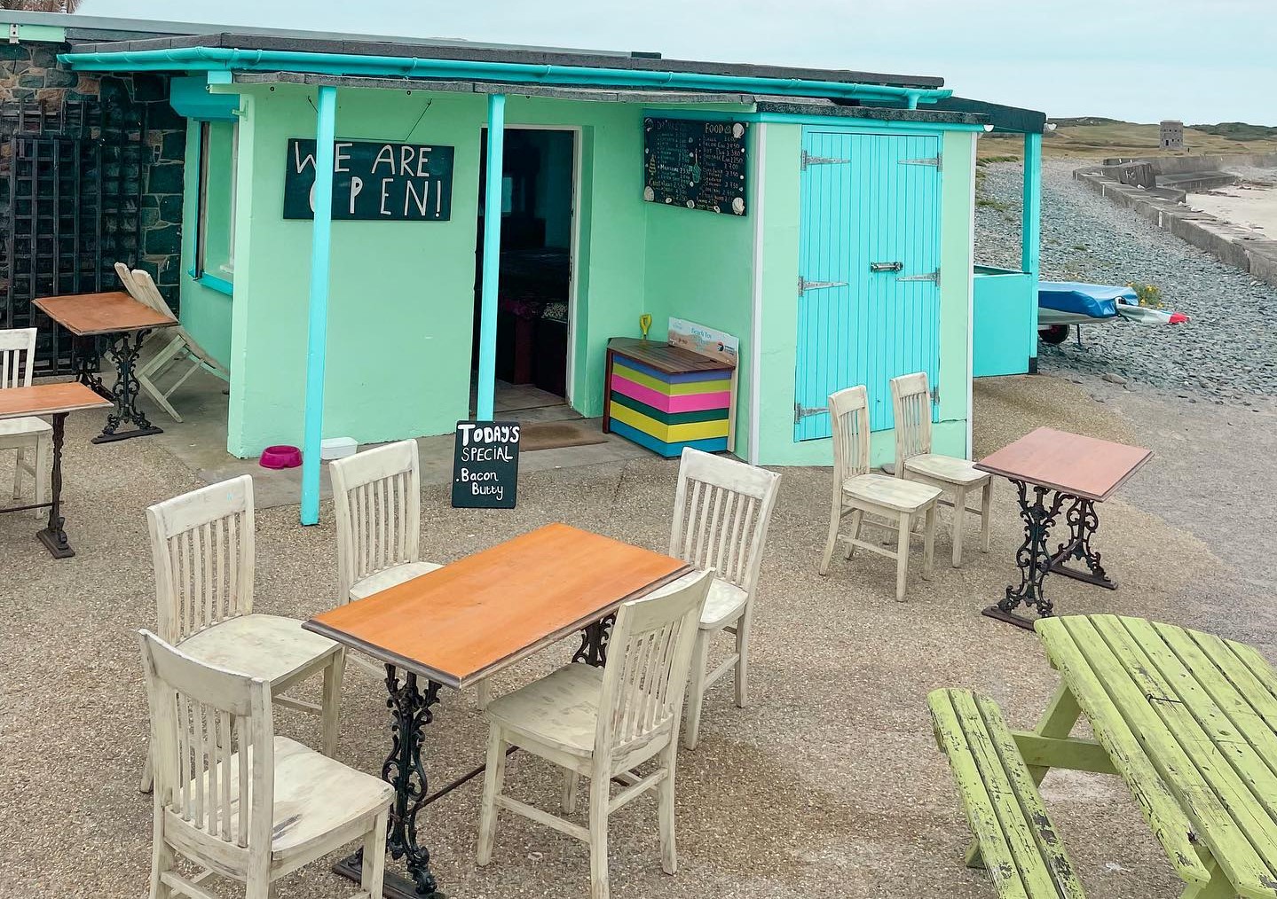 You will find us on the beach, but tucked away in one of the most unspoilt corners of Guernsey, The Vale Common. At the Kiosk at L’Ancresse you can sit in or outside and enjoy the amazing view while enjoying warm local hospitality, and foods fresh from our Guernsey fishermen and the dairy. We serve locally caught crab and octopus and are renowned across the island for our famous Octopus Salad and Seafood Sandwiches. Our menu also includes homemade Guernsey cakes and, in the cooler months, traditional bean jar and soups and stews and the occasional Malay curry or whatever other hearty soul food the Kiosk Kaptain decides to cook up.