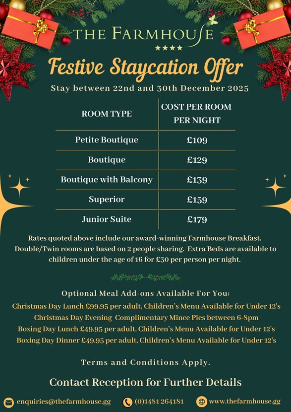 All bookings must be made directly with the Farmhouse Hotel Guernsey quoting "Festive Offer'